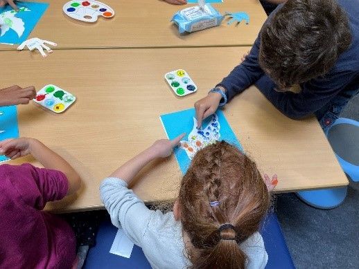 Zum Schluss haben die Drittklässler ihren Patenkindern eine selbstgestaltete „helfende Hand“ überreicht, als Zeichen dafür, dass sie sich immer an sie wenden können, wenn sie Hilfe brauchen.